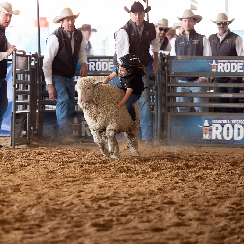 In addition to the action each night in NRG Stadium, Mutton Bustin', presented by H-E-B, also can be found in The Junction, with 5- and 6-year-old participants trying to hold on tight to a sheep for eight seconds. Participation: Participants must be between the ages of 5 and 6 years old and not weigh more than 55 pounds. The cost is $20 per ride. Participation is on a first-come, first-serve basis. Shows start every hour.