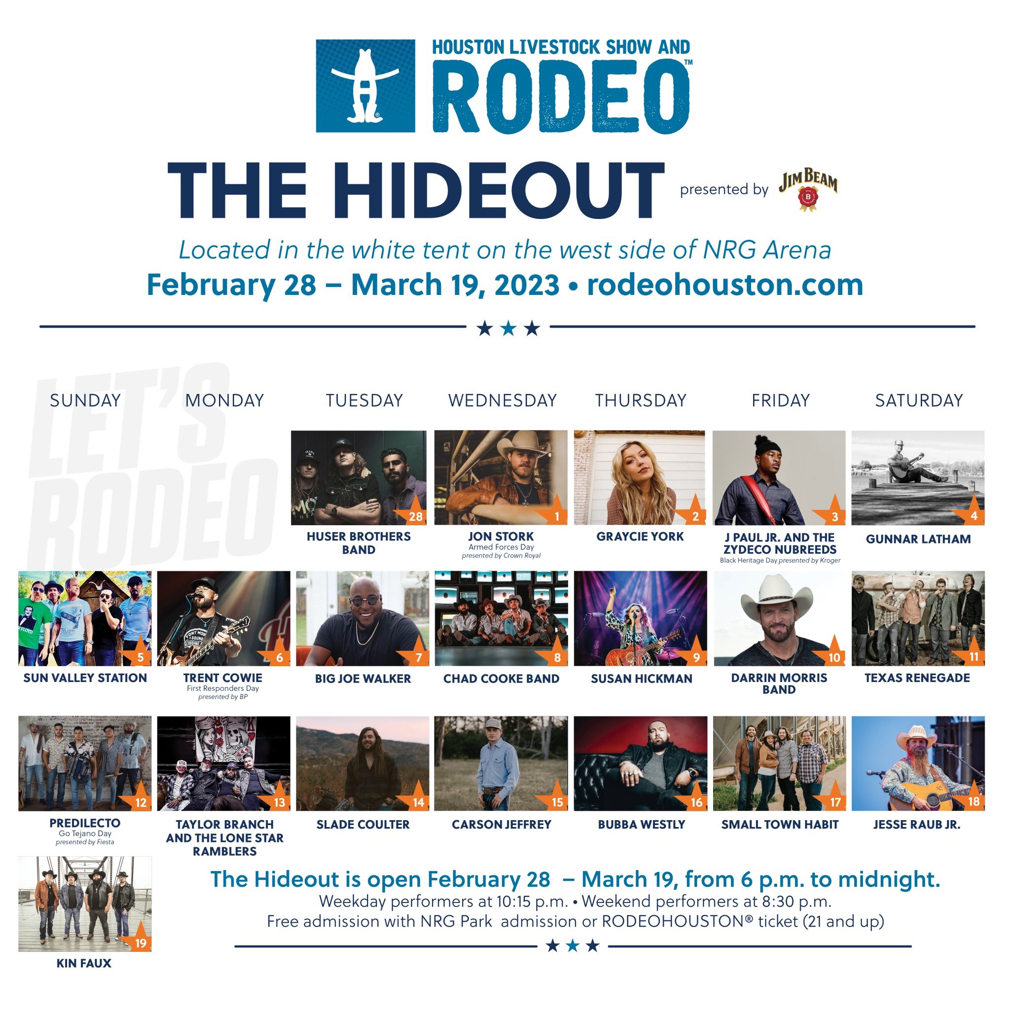 Dance the night away at the Rodeo’s very own honky tonk, The Hideout! Equipped with a spacious dance floor, bars and some of the best up-and-coming musicians, The Hideout is open for those 21 years of age and older, for just the cost of admission to NRG Park. The Hideout is located in a white tent on the west side of NRG Arena. This venue is open to the public.