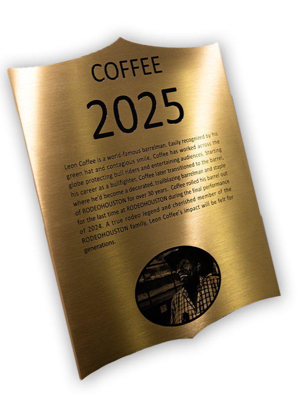 Leon Coffee is a world-famous barrelman. Easily recognized by his green hat and contagious smile, Coffee has worked across the globe protecting bull riders and entertaining audiences. Starting his career as a bullfighter, Coffee later transitioned to the barrel, where he’d become a decorated, trailblazing barrelman and staple of RODEOHOUSTON for over 30 years. Coffee rolled his barrel out for the last time at RODEOHOUSTON during the final performance of 2024. A true rodeo legend and cherished member of the RODEOHOUSTON family, Leon Coffee’s impact will be felt for generations.